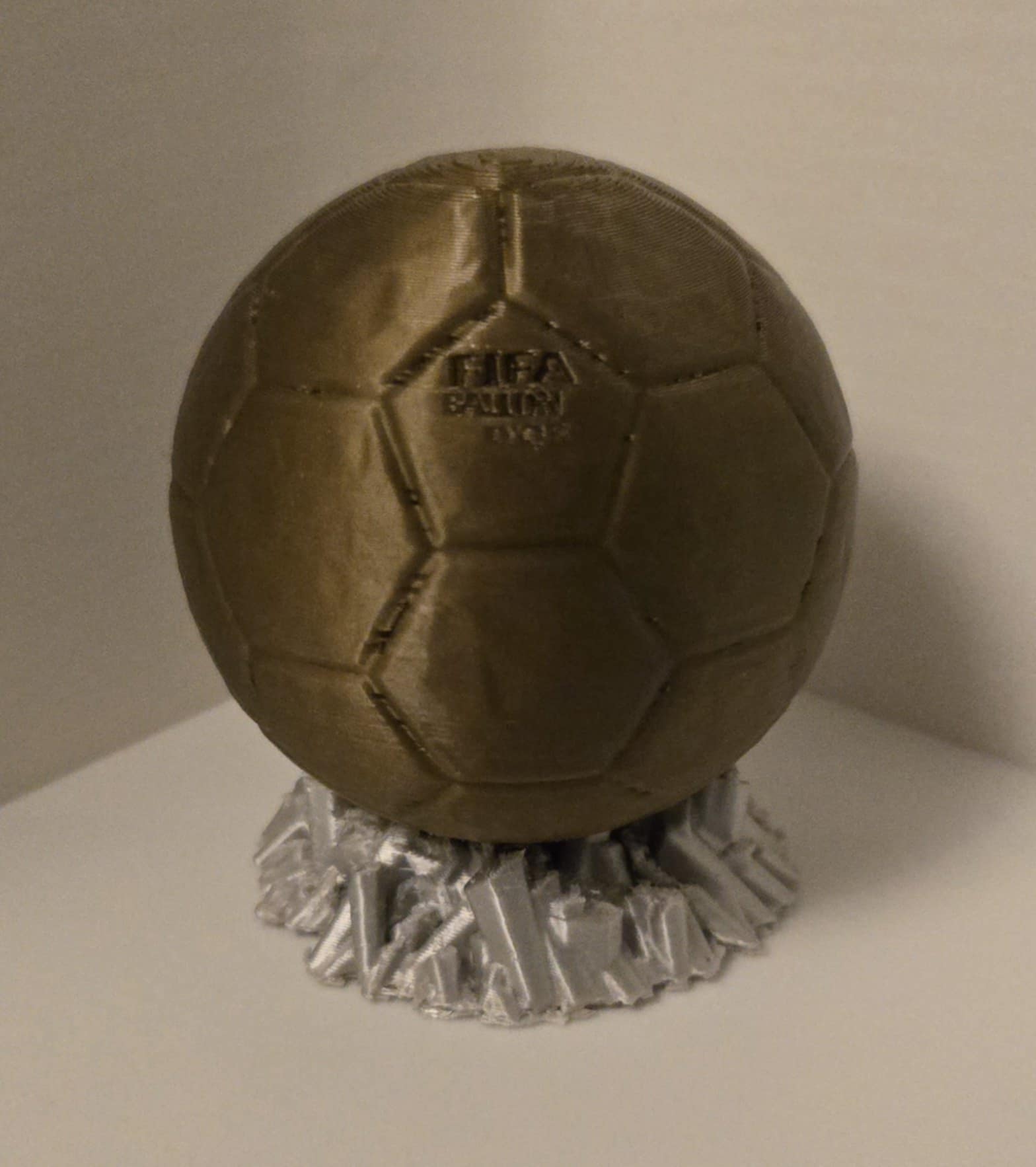 En 3d-printad fotboll som påminner om Ballon d’Or, utmärkelsen till årets bästa fotbollspelare. Höjd ca. 8cm. Perfekt för ett pris till årets bästa spelare i er förening eller för att pryda pojk- eller flickrummet.